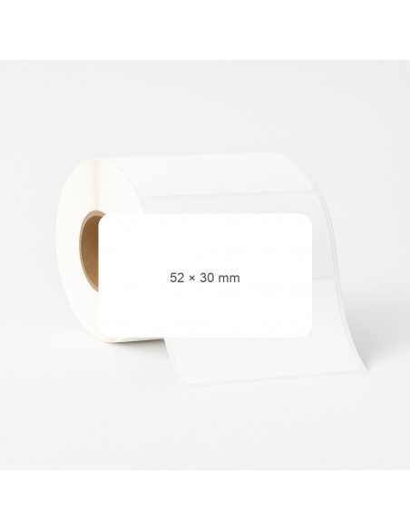 Lipnios etiketės. Plotis:52 mm, Aukštis:30 mm. Medžiaga: Thermo Ecco. Rulonai susukami po 1500 vnt. Kiekis dėžėje: 48 t.